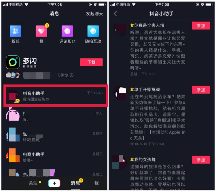接受挑战也是上热门的一个小技巧。在“消息”里面就可以看到非常多的挑战话题。