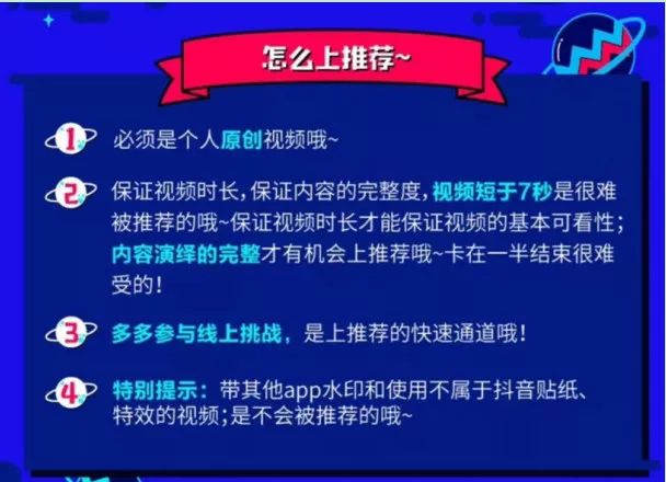 ③视频内容要有亮点:抖音是以原创内容而闻名的短视频APP,因此你的视频内容至少能让观看者get到亮点,看了半天什么亮点都没有,抖音用户是可以长按屏蔽你的内容,那么上推荐的几率就更小了。