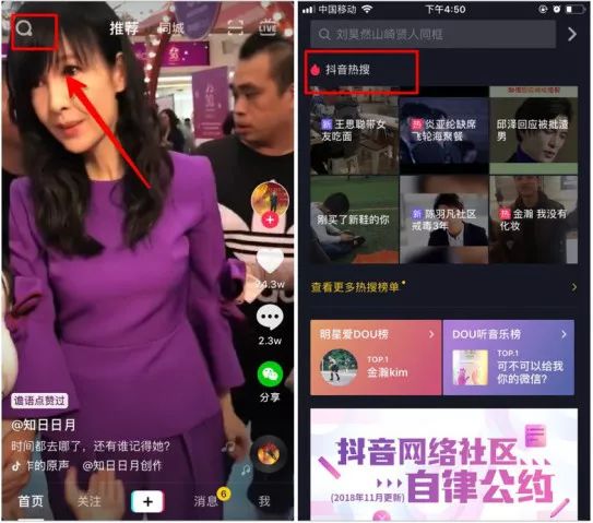 当然,每个时间段的热门话题都不一样,在抖音首页点击左上角【搜索标志】,就能进入热门话题主页了。