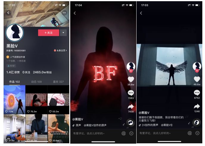 依靠独特的剪辑技术爆火的账号较多,比如拥有2465万粉丝的“黑脸V”,全部通过剪辑技术,制作炫酷视频,吸引粉丝。