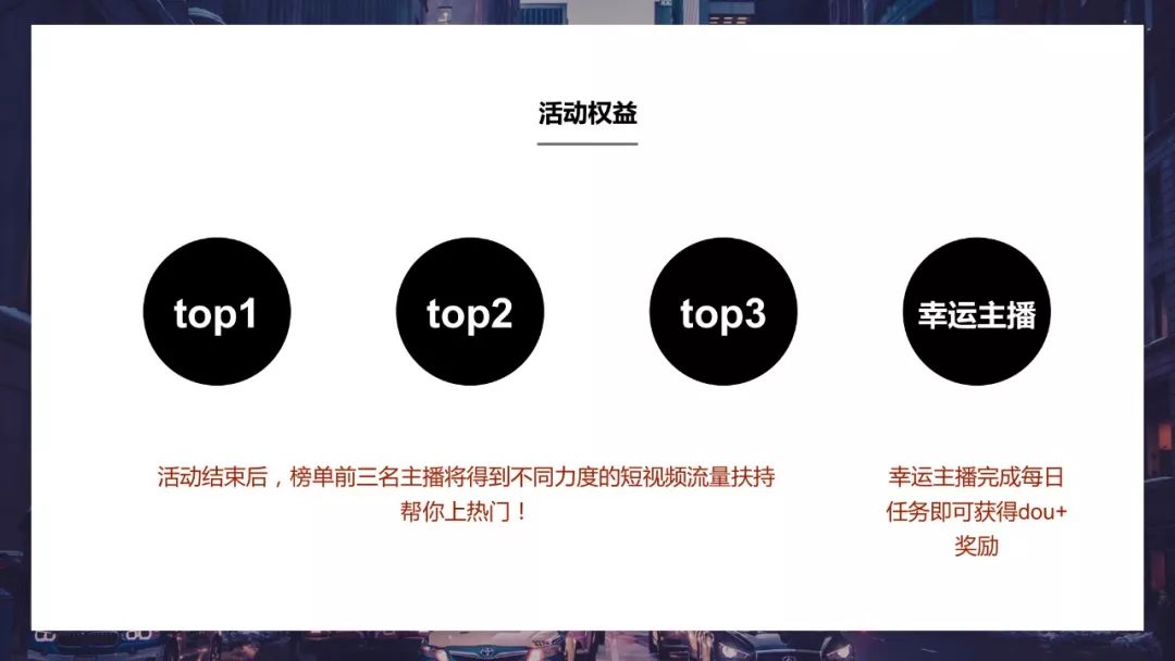 最终抖音平台将会根据榜单排名给到相应的流量奖励,累积TOP1、2、3,分别对应不同量级的流量奖励。