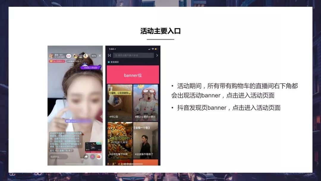 活动的主要入口是直播间右下角的Banner位,点击以后会跳转到活动页面,有活动规则、榜单排名等。所有电商主播的直播间点击开播就能通过入口去看活动页面的情况。另一个入口则是在直播广场的一个Banner位处。