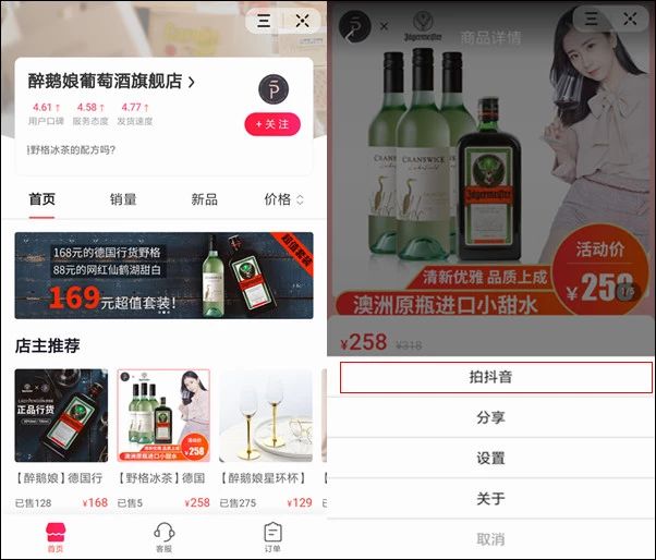 当用户通过小程序“醉鹅娘葡萄酒旗舰店”的拍抖音功能发布视频时,视频页面就会出现商品链接, 有了此功能,红人可以通过免费或者付费的方式让用户为小程序商品作推广。
