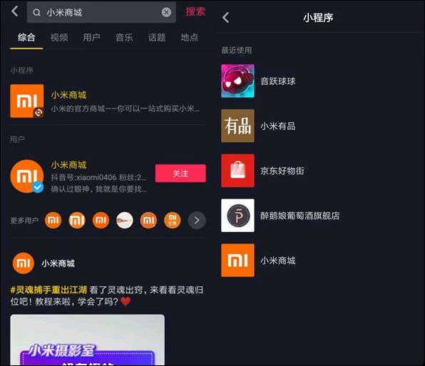 今年的4月14日,抖音上线了“小米商城”“京东好物街”“醉鹅娘葡萄酒旗舰店”“小米有品”等多款电商小程序。